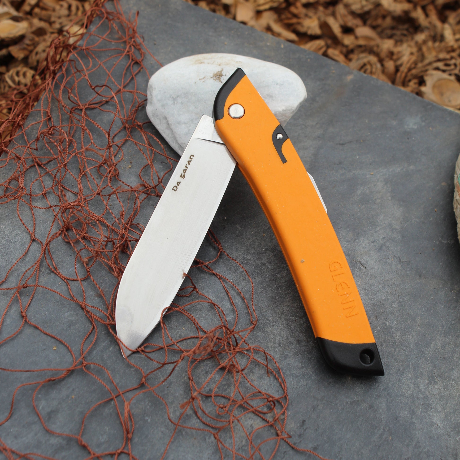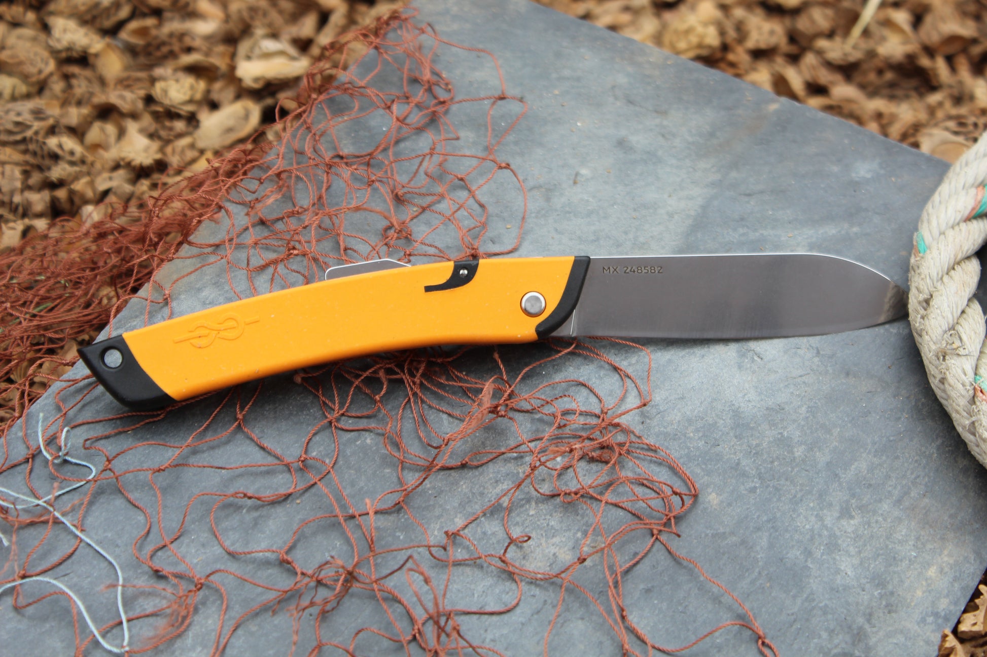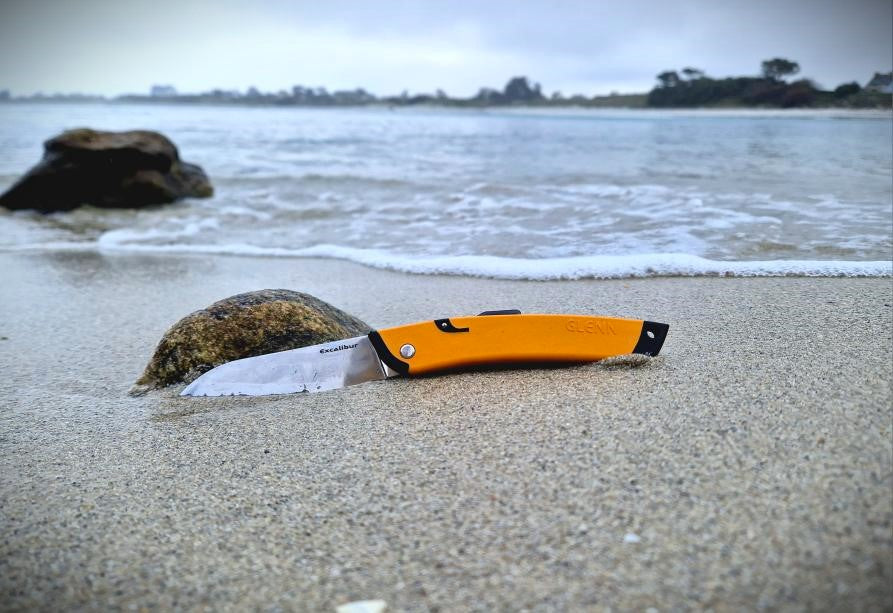 Le Glenn est un couteau traditionnel technique utilisé par les marins bretons. Fabriqué à partir de filets de pêche recyclés, il possède un manche allongé pour une bonne prise en main ainsi qu’une lame de 2,5 mm en inox martensitique MA5. Le cran de sureté a également été travaillé afin de pouvoir l’utiliser en toute sécurité sur un bateau.