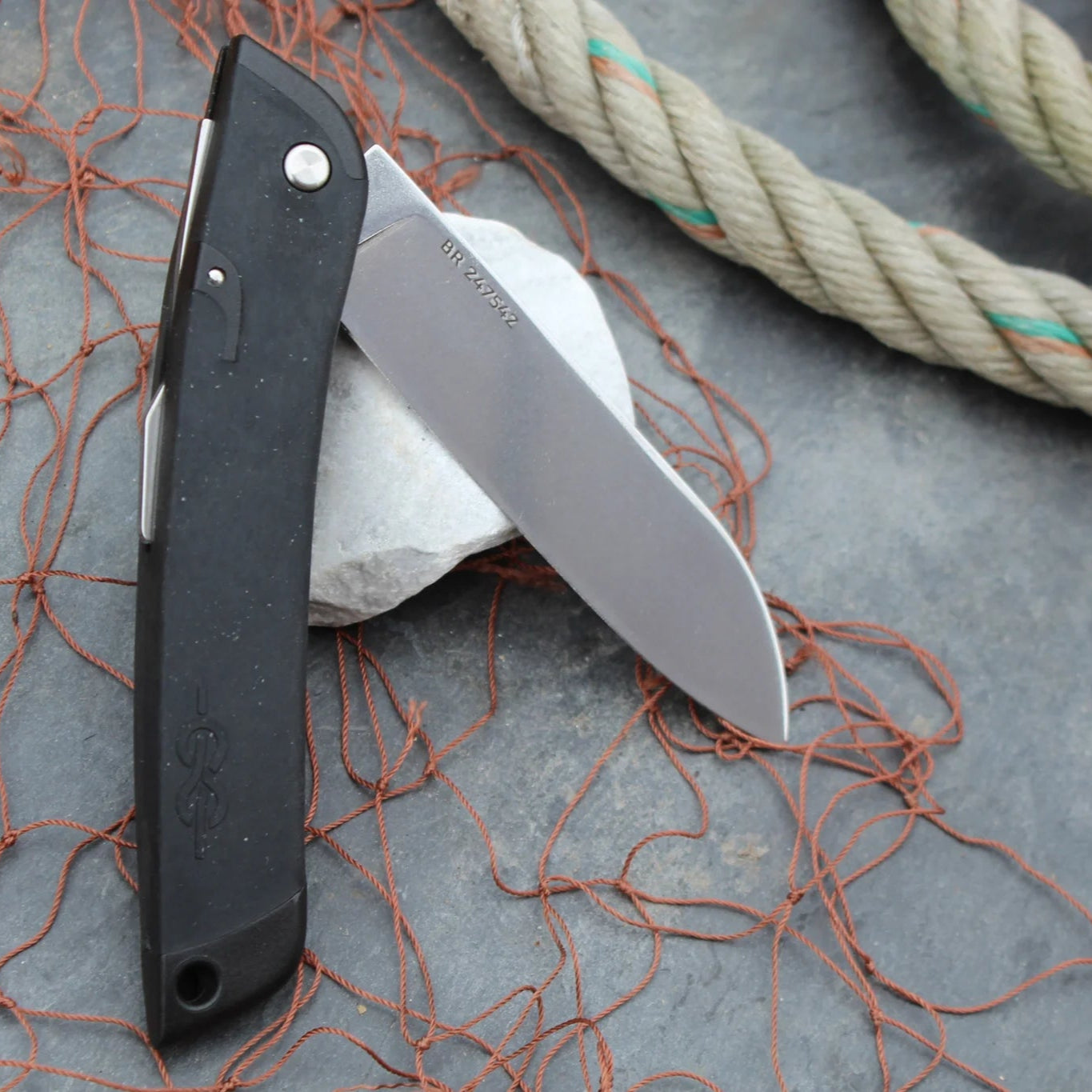 Le Glenn est un couteau traditionnel technique utilisé par les marins bretons. Fabriqué à partir de filets de pêche recyclés, il possède un manche allongé pour une bonne prise en main ainsi qu’une lame de 2,5 mm en inox martensitique MA5. Le cran de sureté a également été travaillé afin de pouvoir l’utiliser en toute sécurité sur un bateau.