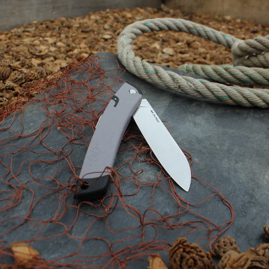Le Glenn est un couteau traditionnel technique utilisé par les marins bretons. Fabriqué à partir de filets de pêche recyclés, il possède un manche allongé pour une bonne prise en main ainsi qu’une lame de 2,5 mm en inox martensitique MA5. Le cran de sureté a également été travaillé afin de pouvoir l’utiliser en toute sécurité sur un bateau.